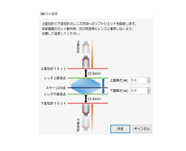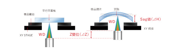 根據被測樣品的反射率等因素, 位移計可能會異常接近或碰撞被測樣品。為防止此情形, 測量前輸入被測樣品的高度(厚度)資料, 防止發生碰撞。
